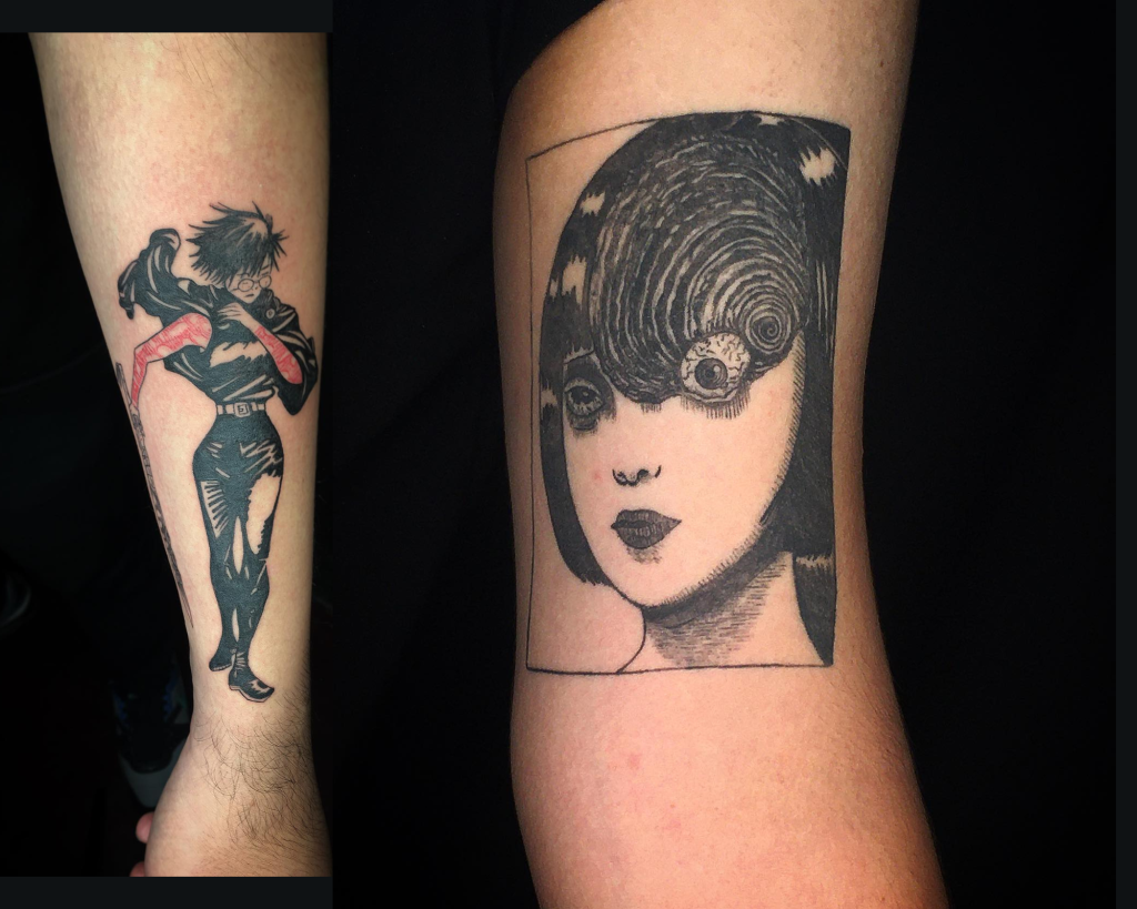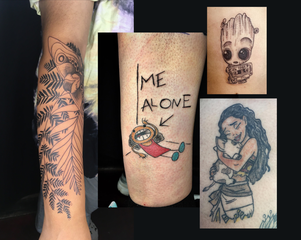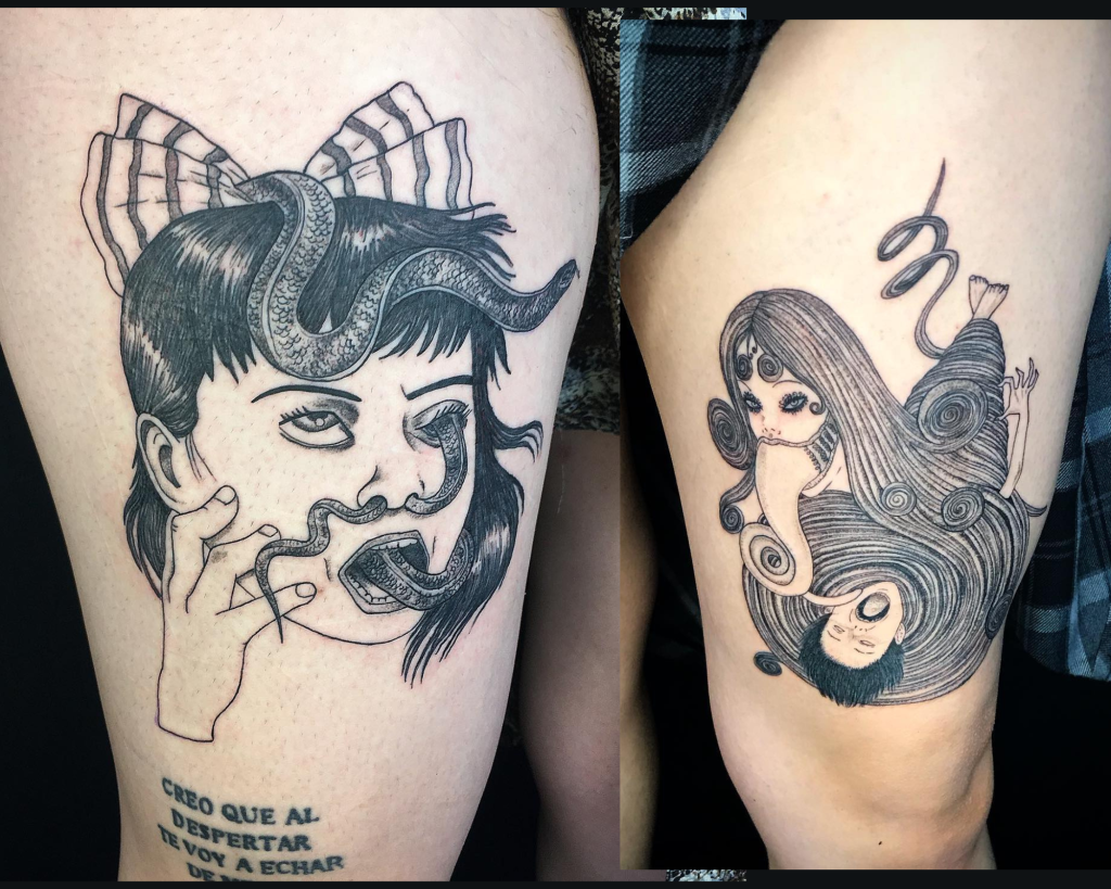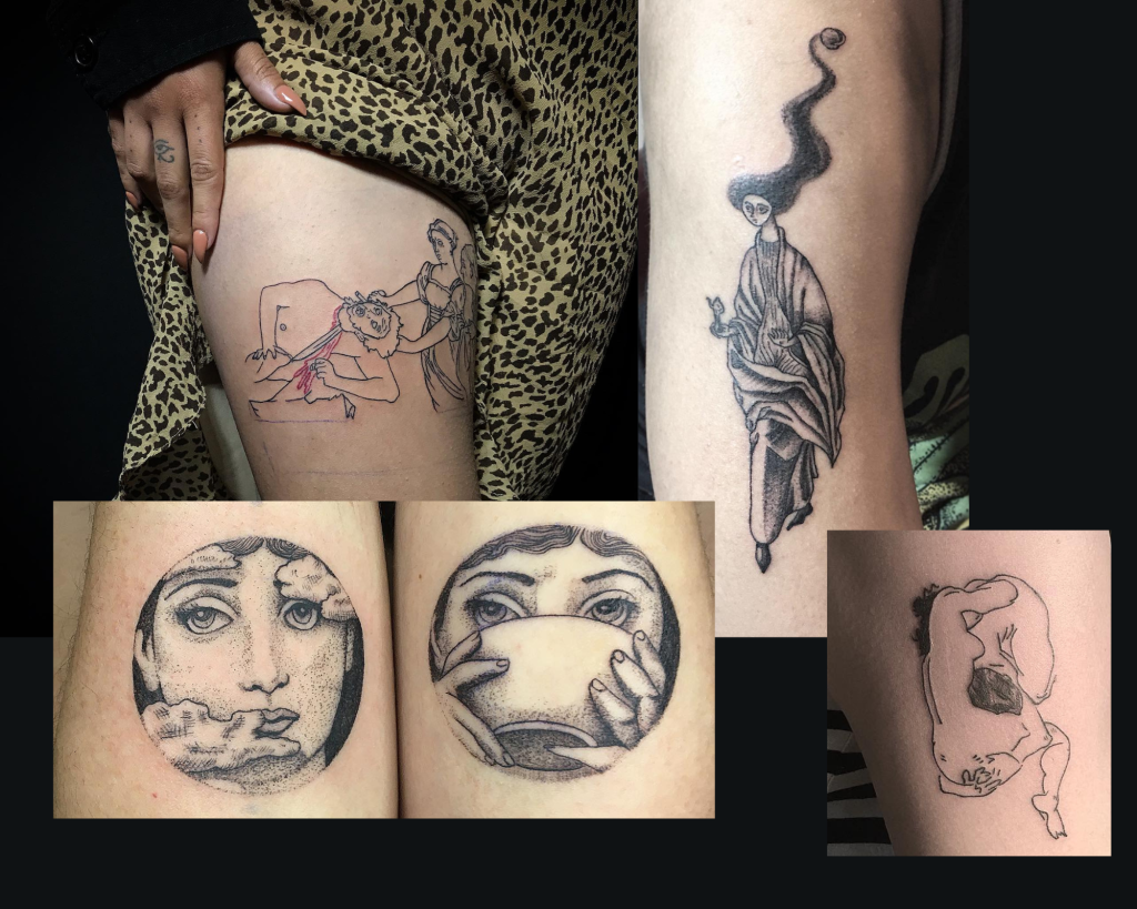 Gran parte de mi práctica se basa también en reproducir imágenes que ya tienen un peso emocional para alguien. Generalmente trato de nunca copiar diseños de otros artistas del tatuaje, pero sí estoy abierta a reproducir caricaturas, imágenes de dominio público, anime, obras de arte, portadas de discos o imágenes de series de tv; o bien, puedo tatuarte ilustraciones de otros artistas siempre y cuando tengamos su consentimiento o hayas comprado la ilustración o diseño.
