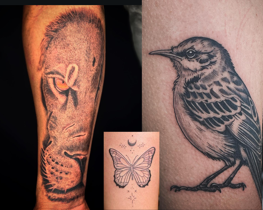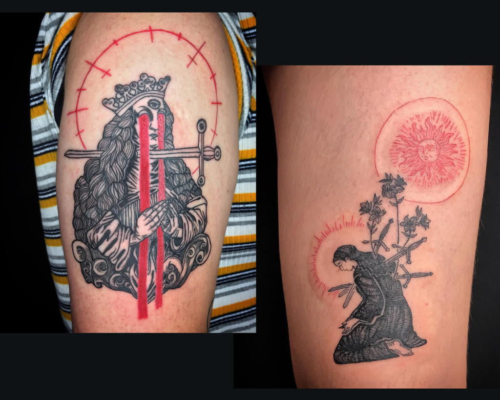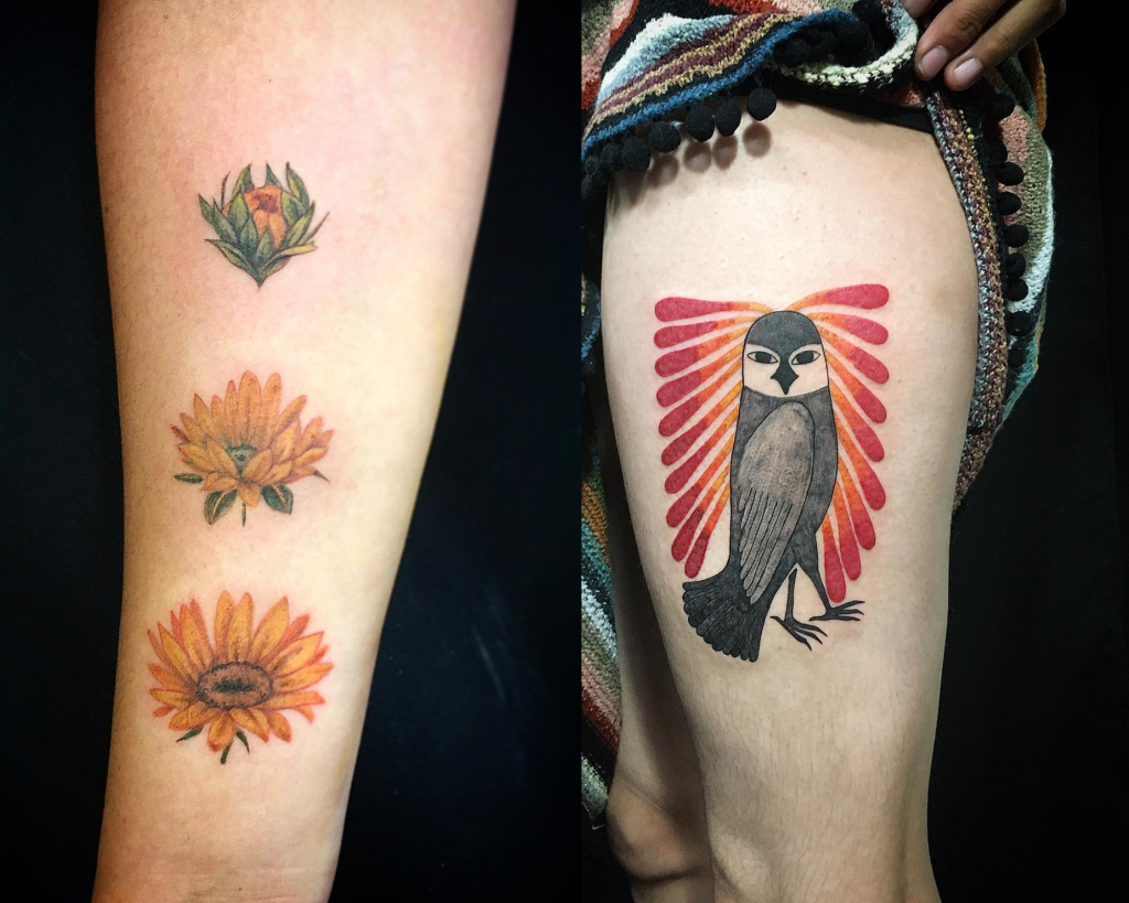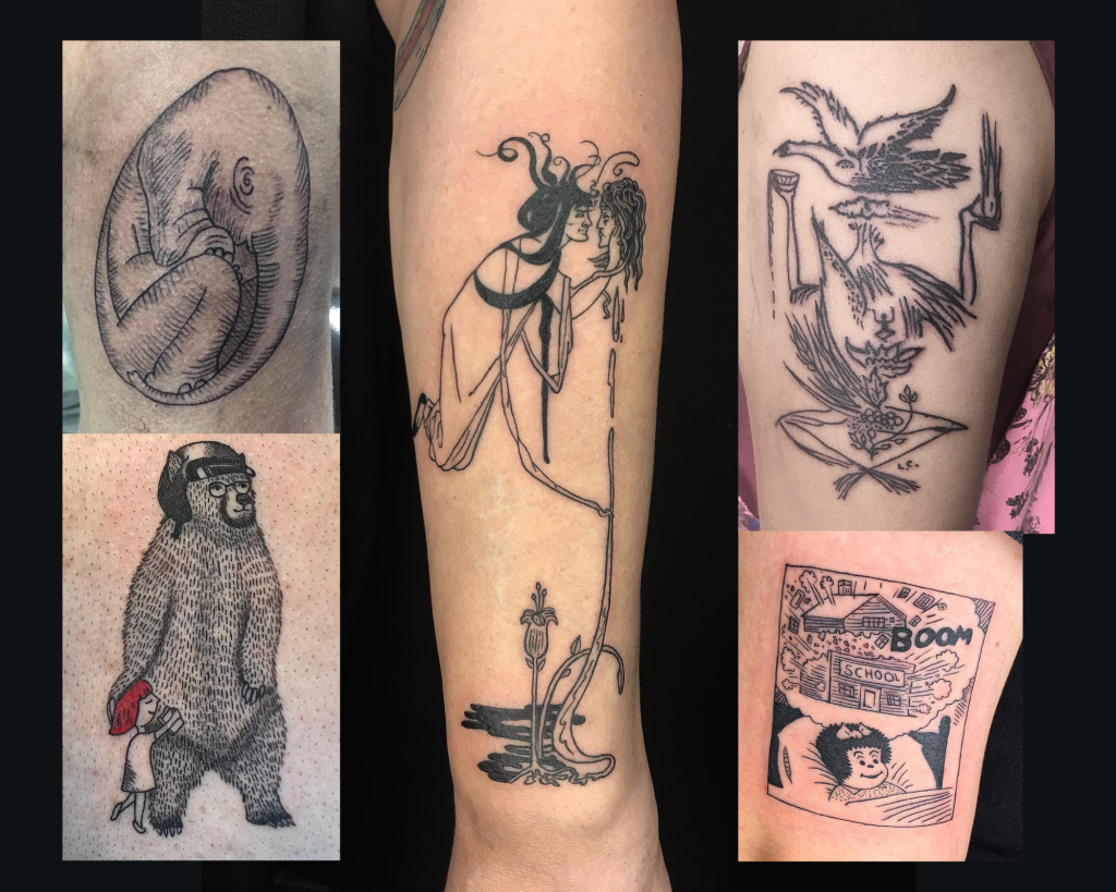 Gran parte de mi práctica se basa también en reproducir imágenes que ya tienen un peso emocional para alguien. Generalmente trato de nunca copiar diseños de otros artistas del tatuaje, pero sí estoy abierta a reproducir caricaturas, imágenes de dominio público, anime, obras de arte, portadas de discos o imágenes de series de tv; o bien, puedo tatuarte ilustraciones de otros artistas siempre y cuando tengamos su consentimiento o hayas comprado la ilustración o diseño.