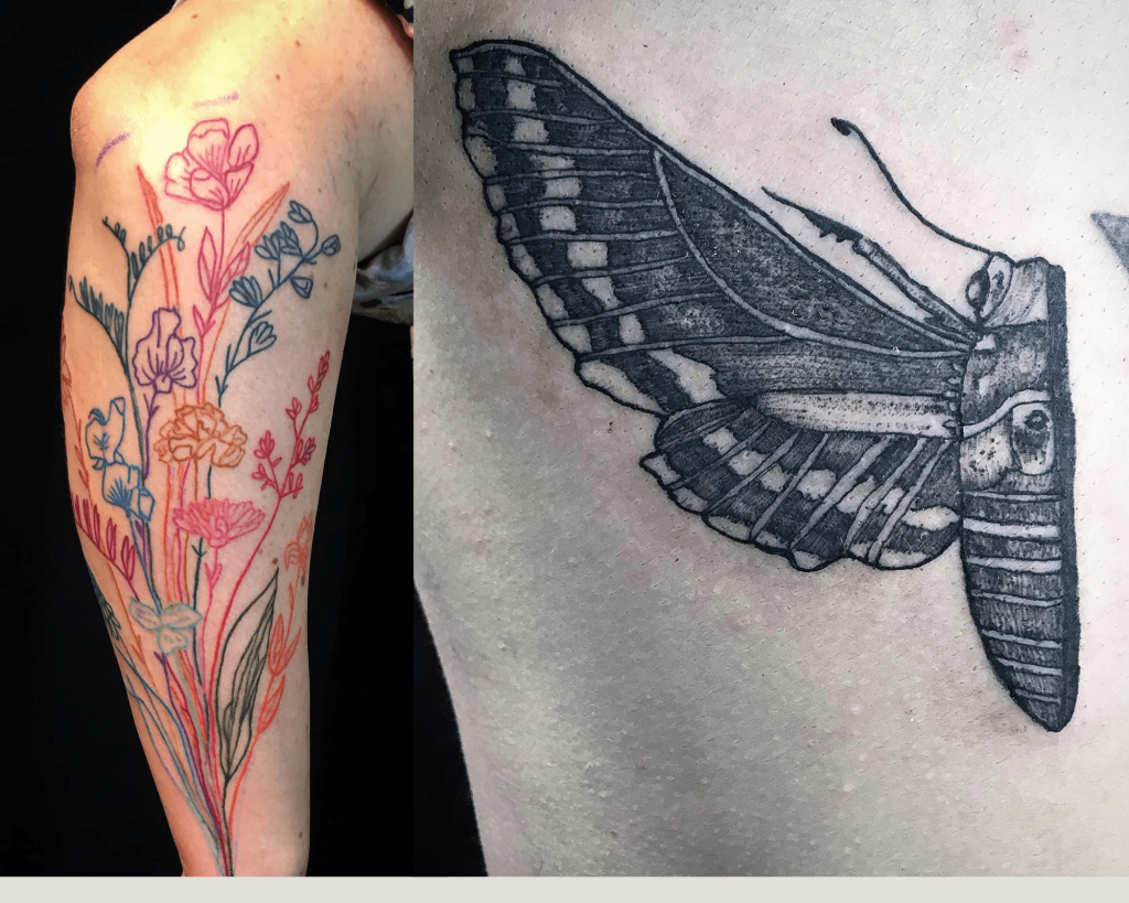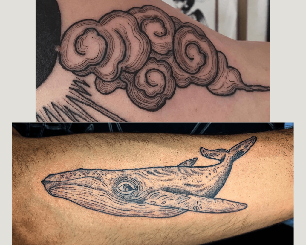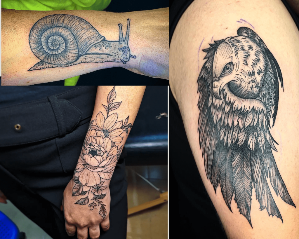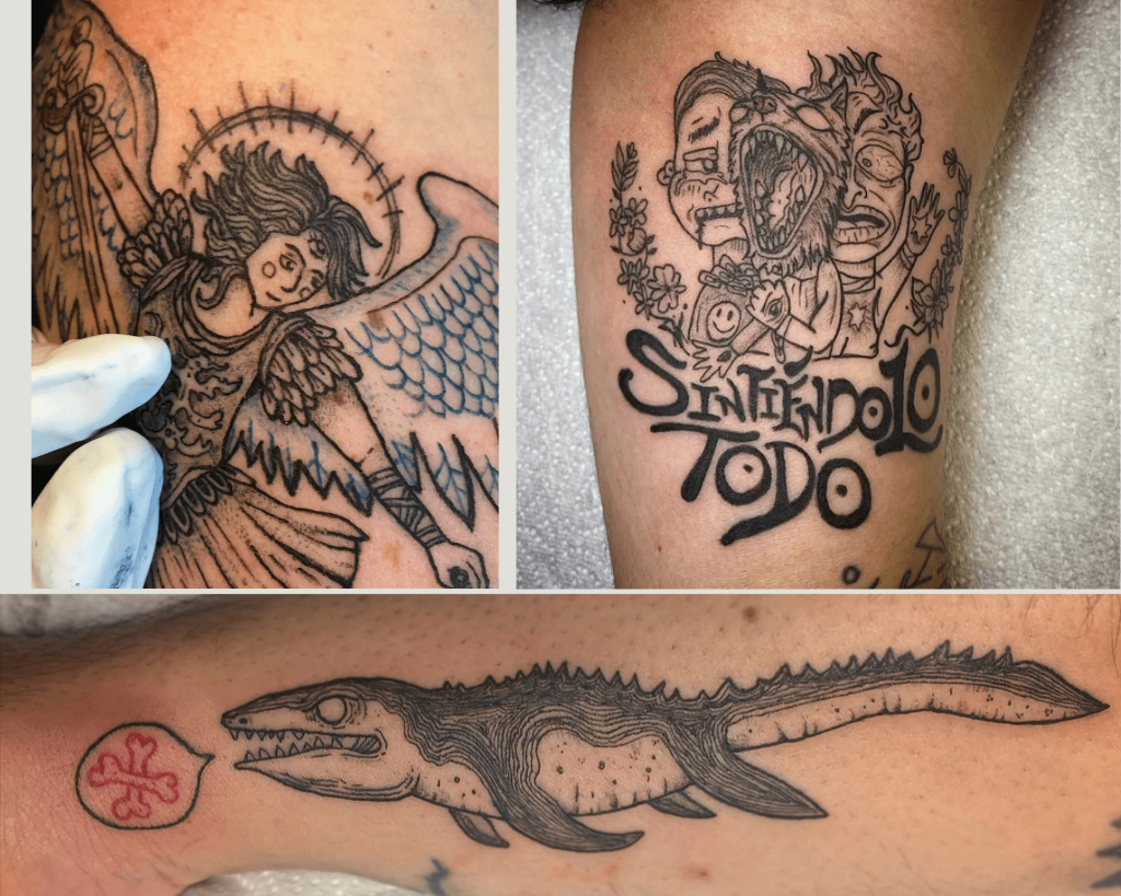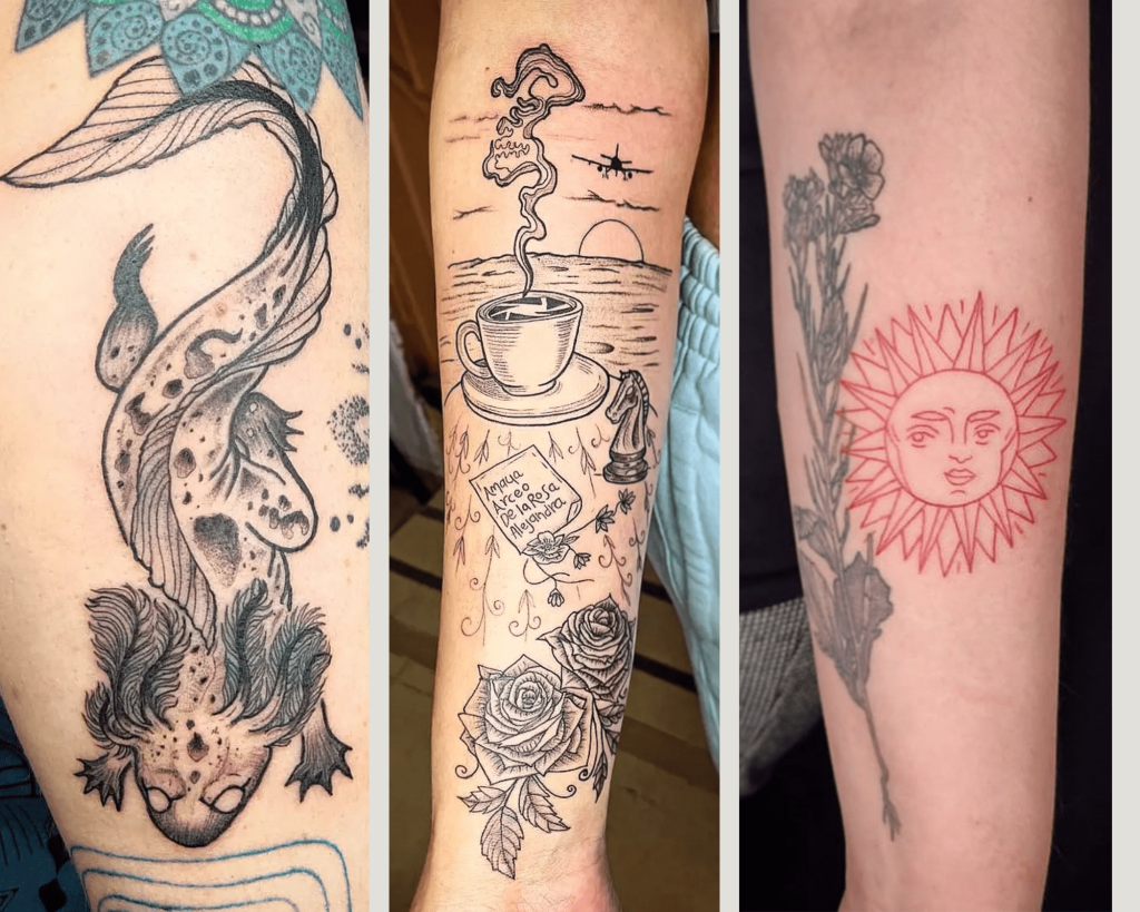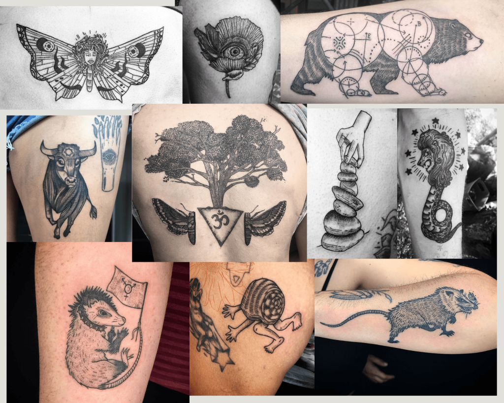 Lo que más me gusta hacer con mi practica tatuajistica, es transformar ideas que pareciera que aun no tienen forma y construir la imagen ideal a la medida de los deseos de la persona que la está solicitando. Para estos diseños fue necesario reunir muchas referencias, tener muchas platicas y acudir con frecuencia a la prueba y error. Algunos son historias, algunos son conceptos elaborados y otros son tatuajes familiares. A veces se parte de una idea sencilla “Dibújame un caracol” ah, pero ¿qué tipo de caracol? El diseño adecuado llegará a la persona adecuada. Cada uno de estos diseños son únicos y fueron hechos especialmente para alguien. Más tatuajes así por favor.