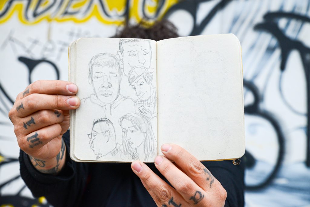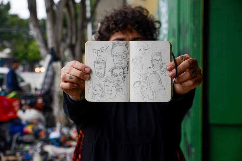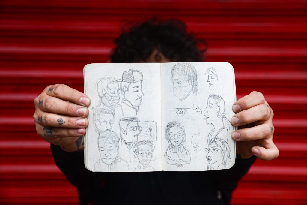 Gente es un proyecto dónde busco retratar a los personajes con los que comparto algún momento en la vía pública, ese lugar donde todos existimos anónimamente. Donde sólo somos caras sin nombre. Algunas veces son personas con las que comparto el transporte público, o algún asiento cercano en un restaurante, las personas con las que hago fila en la cola del super o el consultorio del doctor. Estos encuentros pueden ser fugaces -apenas una estación del metro, unos 3 a 4 minutos- o más consistentes – toda una comida, 40 minutos- Sea de la forma que fuera, dentro de ese limitado espacio de convergenciame concentro en buscar los rasgos más distintivos del sujeto y dejar por sentado y dibujado, una impresión de su prescencia en mi camino.