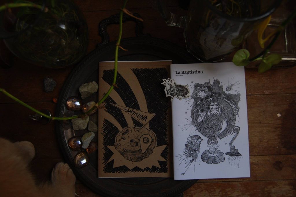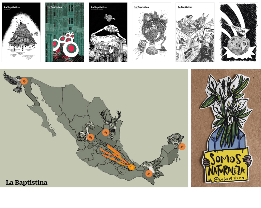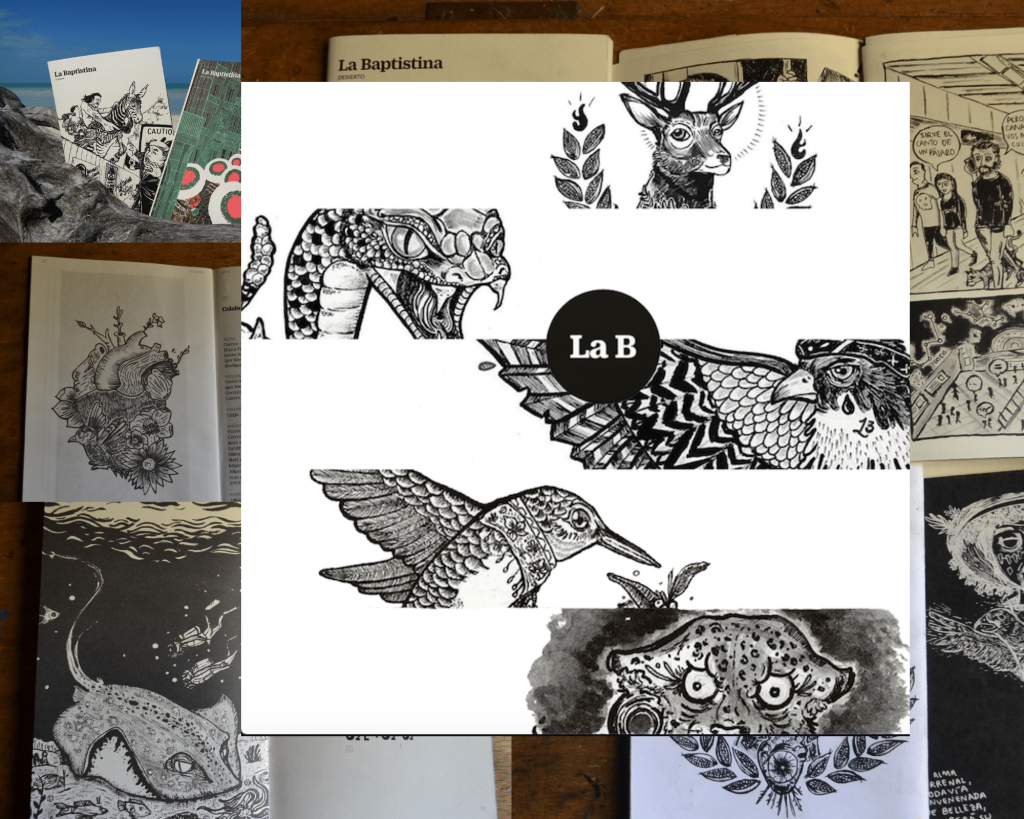 La Baptistina es una revista que trata de lugares específicos y cómo nos conectamos a estos. Reune a creadores de diferentes áreas — literatura, fotografías, ilustraciones, comics y collages– para dar su visión de estos espacios geográficos. Fue creada en el 2015 por Diana Trejo y yo. Eventualmente ella llevó la batuta. Participé activamente en las 6 ediciones que se han impreso hasta ahora, hice todas las contraportadas, 4 portadas, y se han incluido comics e ilustraciones para casi todos los números. Actualmente se preparan para sacar un nuevo número. Puedes leerlas y consultar sus redes aquí: